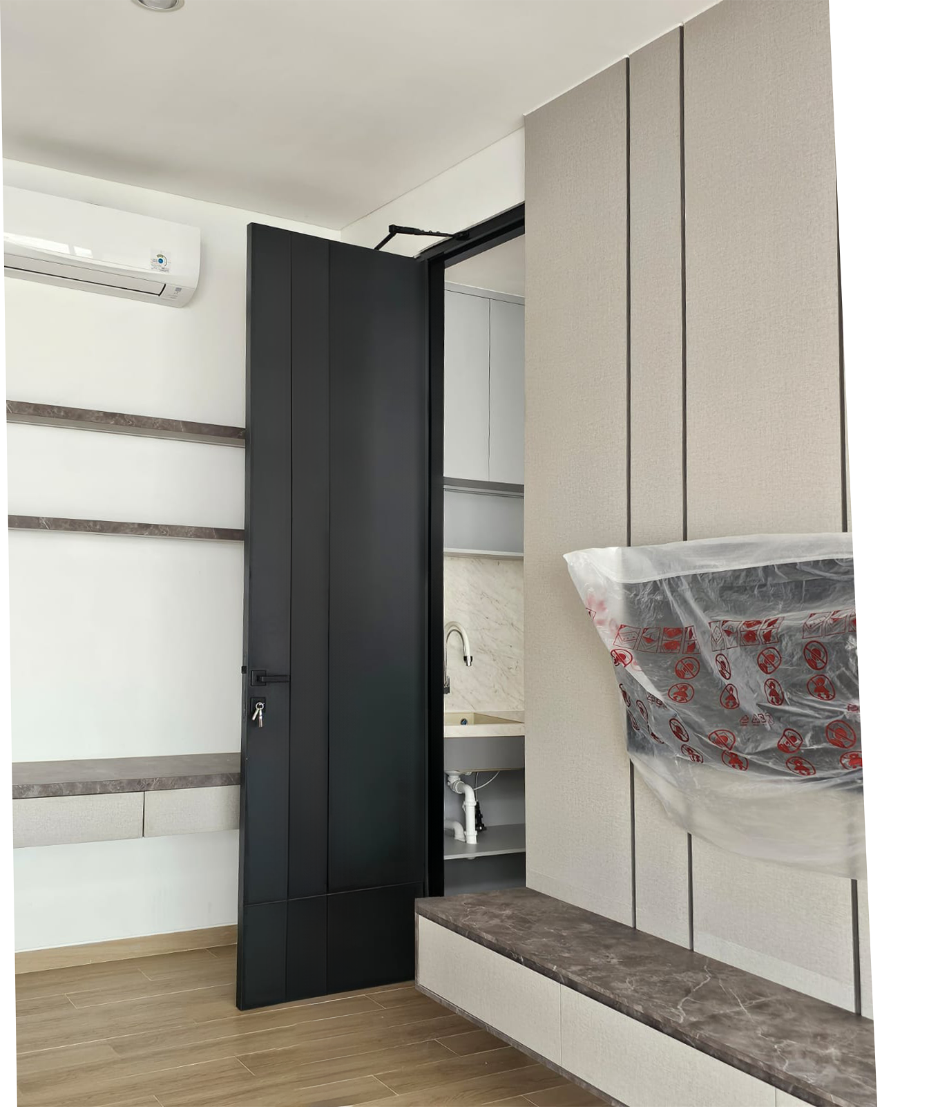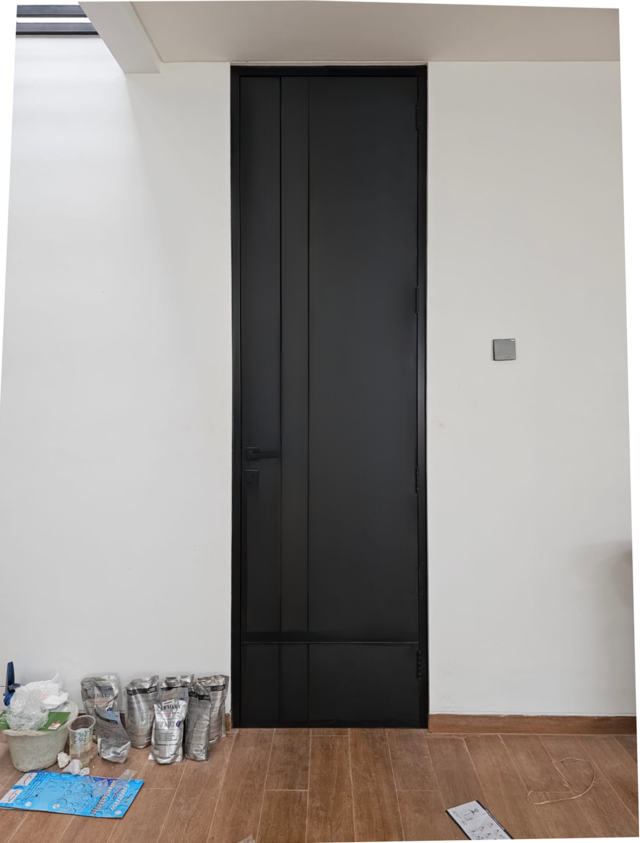 beberapa item pekerjaan pintu enginering HPL taco black untuk hunian pribadi, dikombinasi dengan kusen aluminium serta aksesoris pintu dekson black